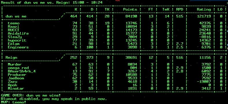 Code:Result of BONK! vs. dun vs me: 15:00 - 3:46 ,---------------------------------+------+------+-----------+------+------+-----+-----------+----. | K | D | TK | Points | FT | TeK | RPD | Rating | LO | | ,------+------+------+-----------+------+------+-----+-----------+----+ | BONK! / 391 | 239 | 17 | 90157 | 7 | 17 | 321 | 146531 | 1 | +------------------------' | | | | | | | | | | squallFF8 90 | 19 | 0 | 17521 | 2 | 2 | | 36065 | 0 | | Cig <ER> 0 | 4 | 0 | 0 | 0 | 0 | 1.8 | 0 | 1 | | claushouse 60 | 38 | 0 | 12721 | 0 | 2 | | 9296 | 0 | | Vehicle 12 | 50 | 2 | 5093 | 1 | 0 | 2.8 | 9334 | 0 | | zidane 17 | 56 | 3 | 6210 | 2 | 3 | 3.1 | 12745 | 0 | | megaman89 78 | 25 | 12 | 16425 | 1 | 5 | | 53374 | 0 | | EvilDeed 60 | 17 | 0 | 12834 | 1 | 2 | | 13773 | 0 | | tim 20 | 4 | 0 | 7229 | 0 | 2 | | 2337 | 0 | | NL>Trigger 54 | 26 | 0 | 12124 | 0 | 1 | | 9607 | 0 | +---------------------------------+------+------+-----------+------+------+-----+-----------+----+ | ,------+------+------+-----------+------+------+-----+-----------+----+ | dun vs me / 197 | 359 | 7 | 19186 | 7 | 3 | 336 | -7191 | 0 | +------------------------' | | | | | | | | | | Ra 27 | 41 | 0 | 1467 | 0 | 0 | | -126 | 0 | | jordanN 28 | 53 | 0 | 2373 | 1 | 0 | | -558 | 0 | | hulk <ER> 4 | 66 | 1 | 838 | 1 | 0 | 2.4 | 1323 | 0 | | Zagis 35 | 48 | 0 | 3235 | 1 | 1 | | -402 | 0 | | Iron Survivor 2 | 10 | 0 | 619 | 0 | 1 | | -64 | 0 | | SleaZy 20 | 17 | 0 | 2063 | 1 | 0 | | -13525 | 0 | | Geio 9 | 6 | 0 | 1650 | 0 | 0 | | 246 | 0 | | Eelam 14 | 70 | 6 | 1963 | 3 | 1 | 2.5 | 3241 | 0 | | Engineers 58 | 48 | 0 | 4978 | 0 | 0 | | 2674 | 0 | `---------------------------------+------+------+-----------+------+------+-----+-----------+----' GAME OVER: BONK! wins! MVP: megaman89!