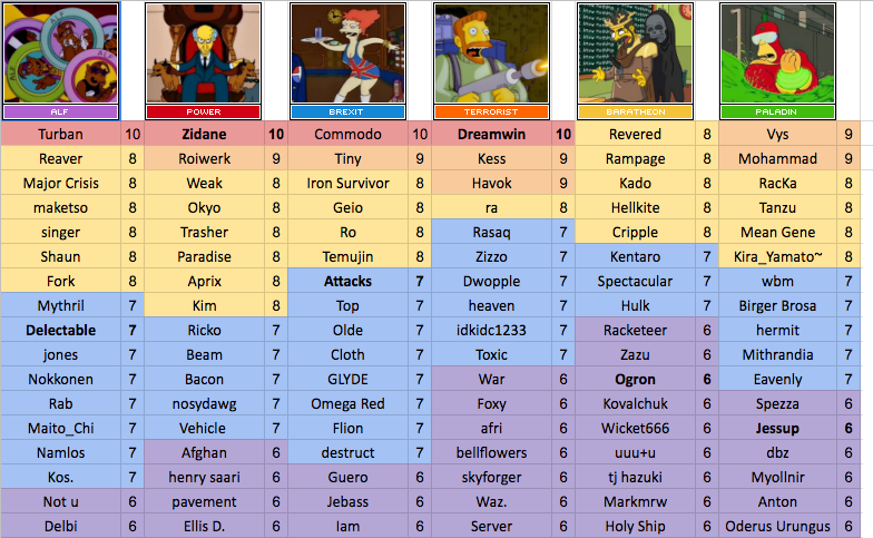 Zidane, as one of the most successful captains in TWDT and TWLJ, has put together a ferocious DTJ line up. Early pick Roiwerk can rack up 15 kills regularly without breaking sweat. Zidane himself seems to be as hungry as ever. Indeed, there is a lot of 8*+ talent on this team- but perhaps too much. As the phrase goes, too many cooks spoil the broth. After all, only 3 of these players can play at any one time, and feeling like you're surplus to requirements can be bad for morale. I think Zidane, who has always tended to stick with a Thunder / North American base, will struggle to man-manage this team, who will have little patience for his outbursts. Of course the quality and experience of Roiwerk, Trasher, Kim & Aprix barely need mention, and maybe that will be enough on the day. But they're all individually-minded players, and similar personalities for that matter… with more than a whiff of that North European nonchalance that comes when you live in darkness for 10 months of the year. Obtuse personalities & likely resentment aside, Power have some huge weapons, with two of the better 7* javs in Ricko & Bacon, some solid 6*s, and Okyo who is uniquely aggressive.