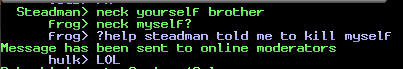Steadman reports Best for threatening his life IRL. Provides a valid screenshot of said conversation. Forwards it to a smod who forwards it to me. My initial reaction is this line of thinking: Steadman is pressing Best repeatedly over and over as he does to many people, finally Best flips the switch and says something he shouldn't have. Steadman jumps on the opportunity and reports it, knowing Best will have to be banned. Then Steadman will turn around and ROFL at Best for being banned.