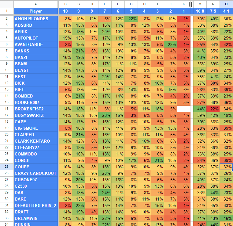 Since my original post is pretty busy and there's a lot of updates/comments in there, I thought I'd start a new topic with a new sheet. Aside from the previous sheet of overall player data, winning percentage by teams, and percentage of kills attributed to each player, I got bored and decided to add a new tab with a calculated game score.
